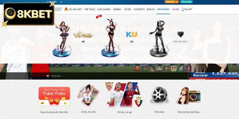 8KBET là một sân chơi cá cược nổi tiếng trên thị trường châu Á và đang nắm giữ số lượng thành viên cực khủng. Để có sự thành công như ngày hôm nay, sân chơi đã cập nhật đa dạng các loại hình giải trí khác nhau nhằm đáp ứng toàn bộ nhu cầu cho từng đối tượng khách hàng.